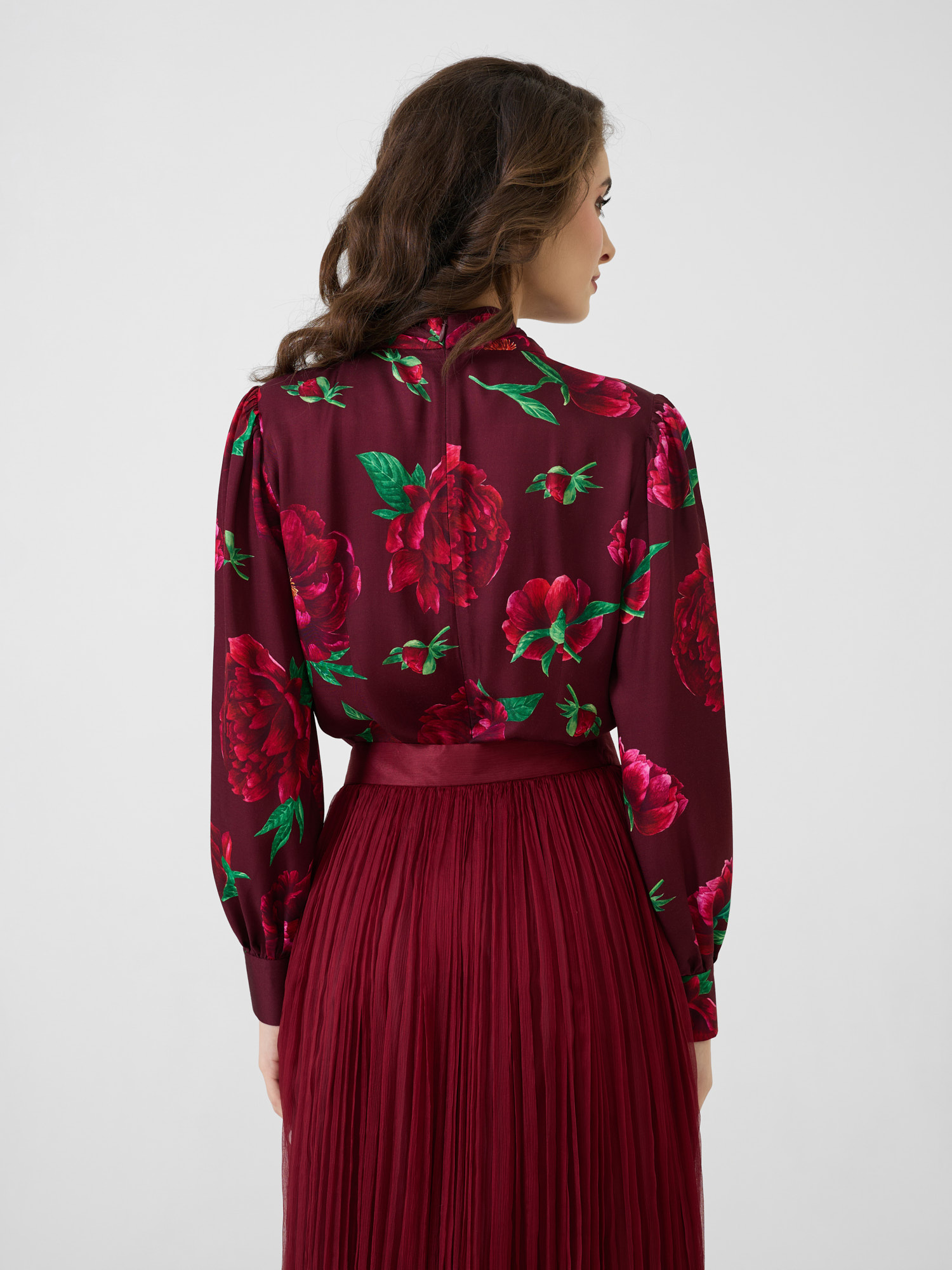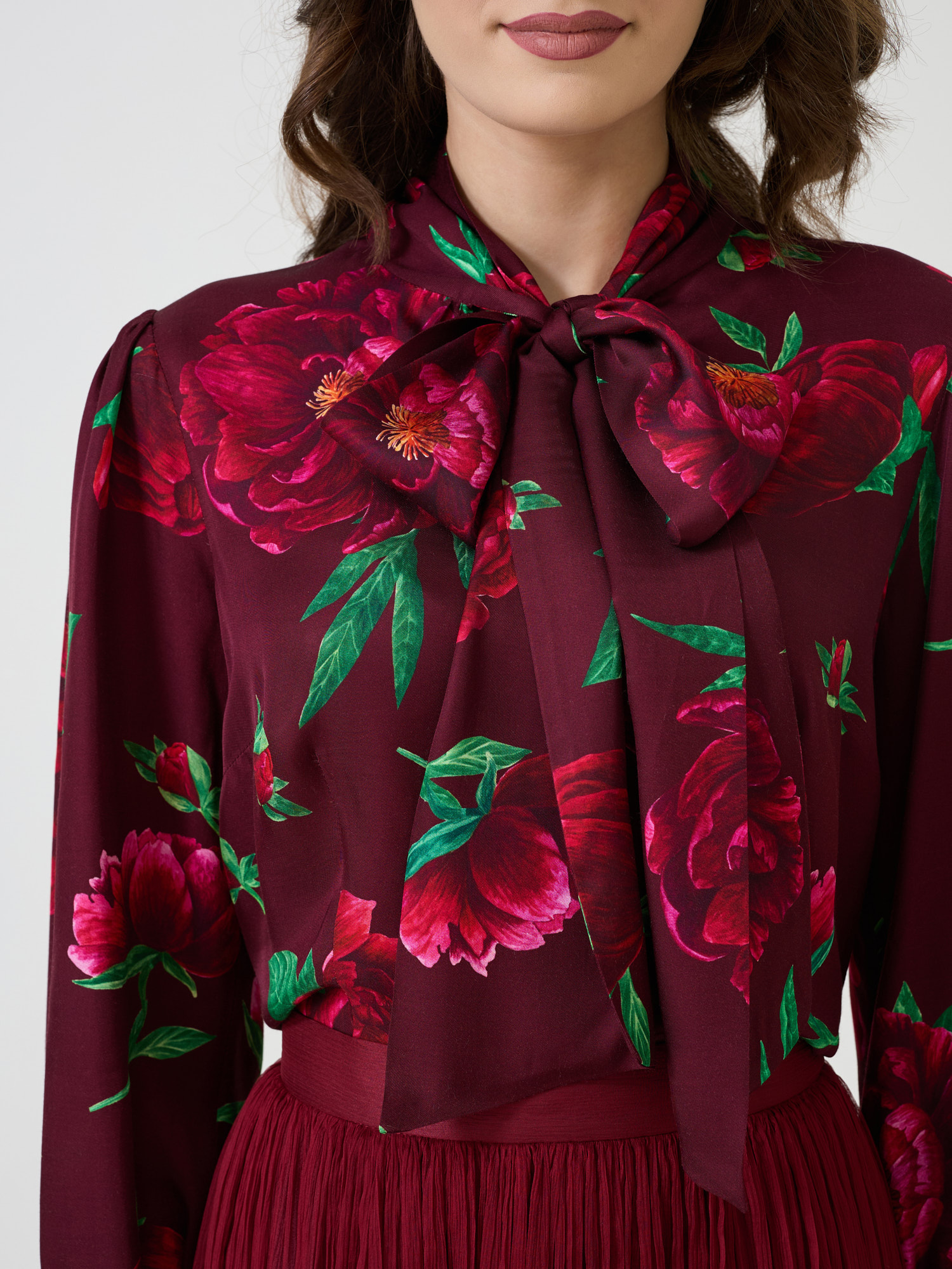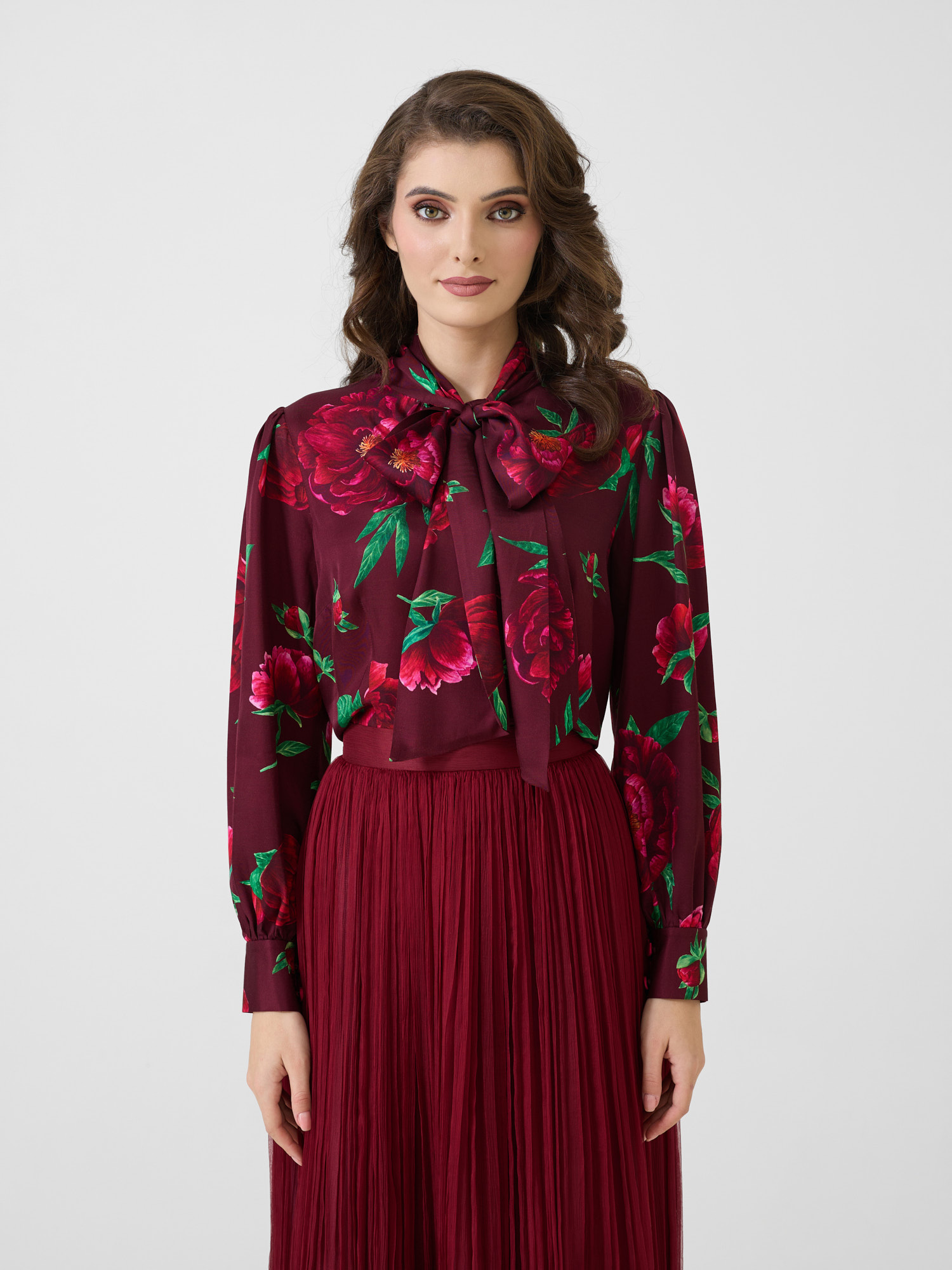 Cămașă elegantă cu fundă și print Bujorul Românesc.