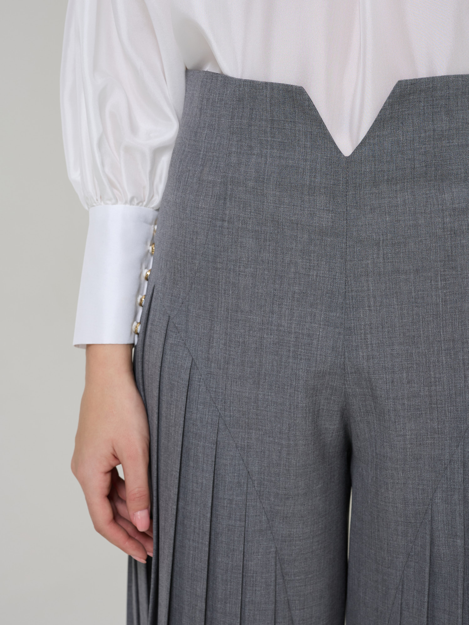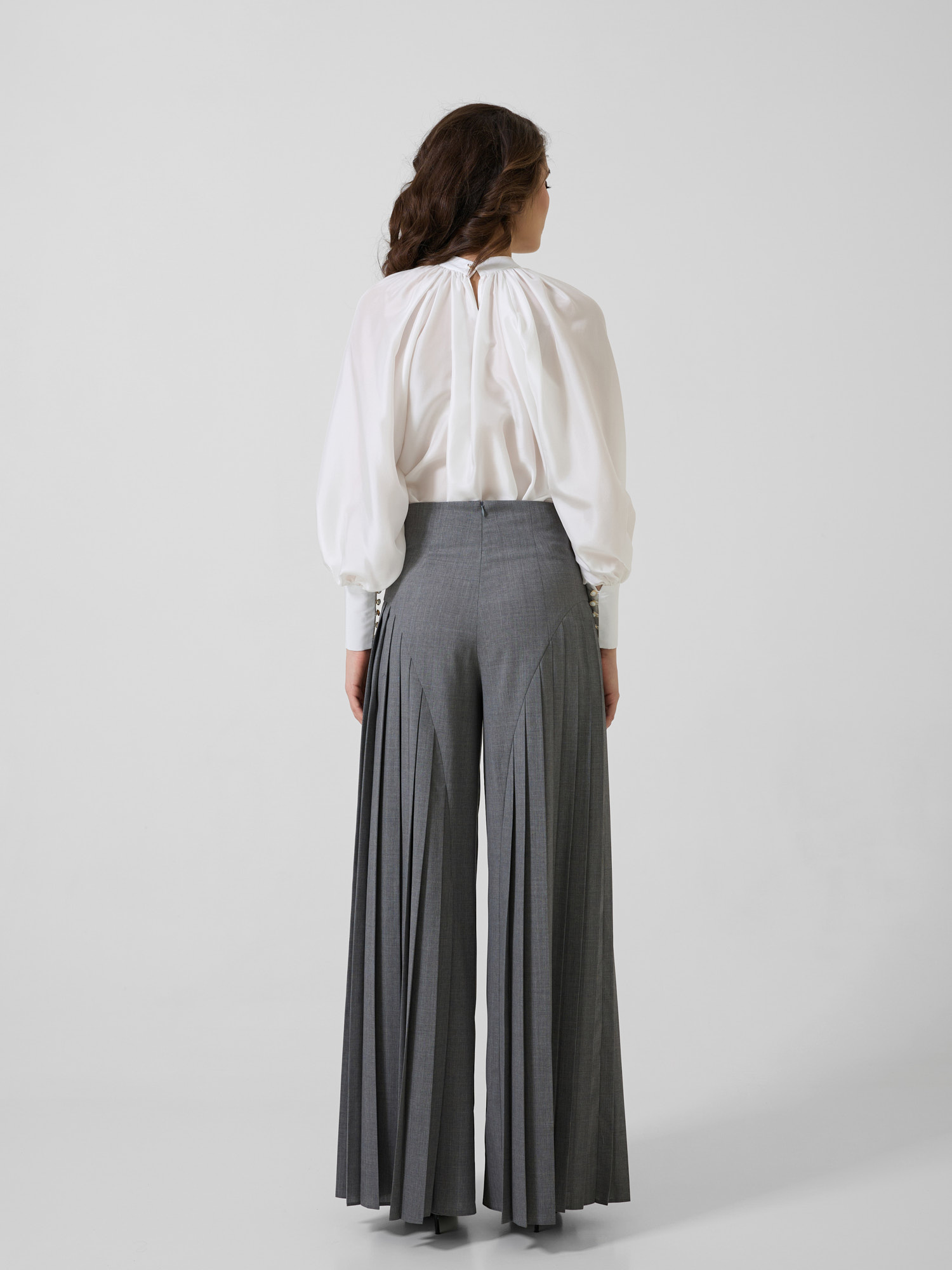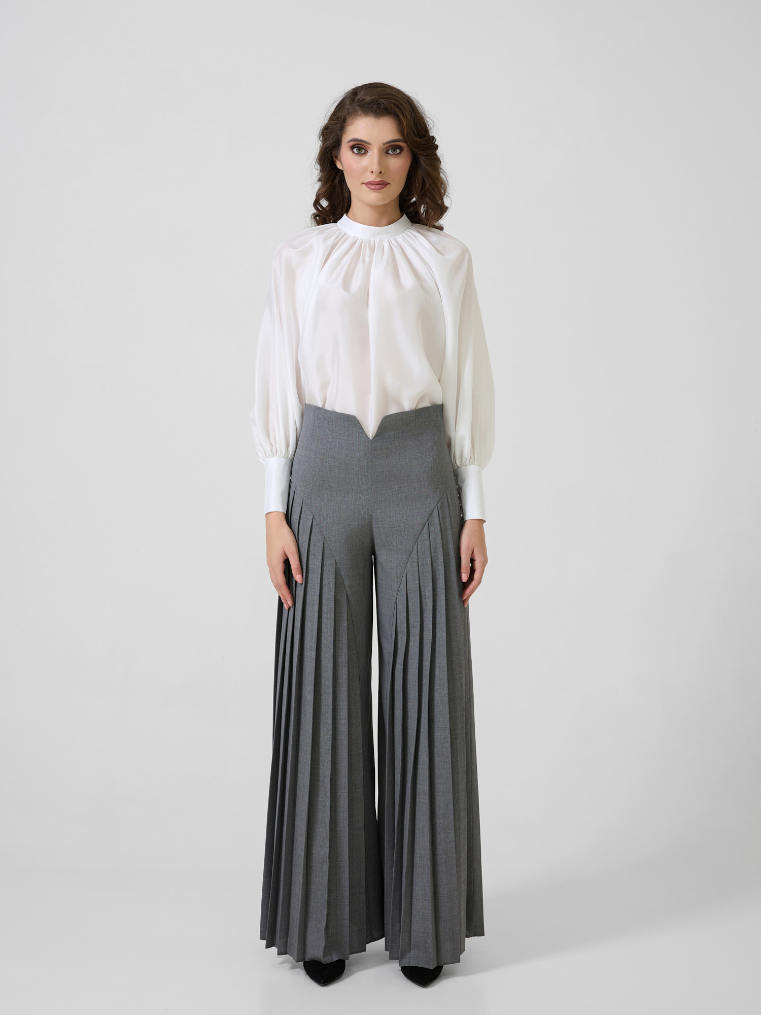 Pantaloni cu talie înaltă și detalii plisate.