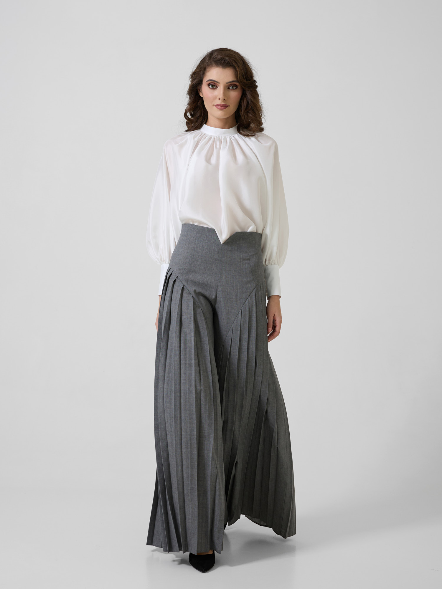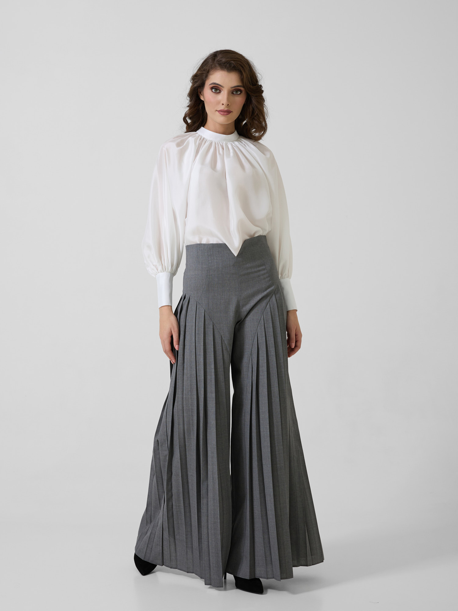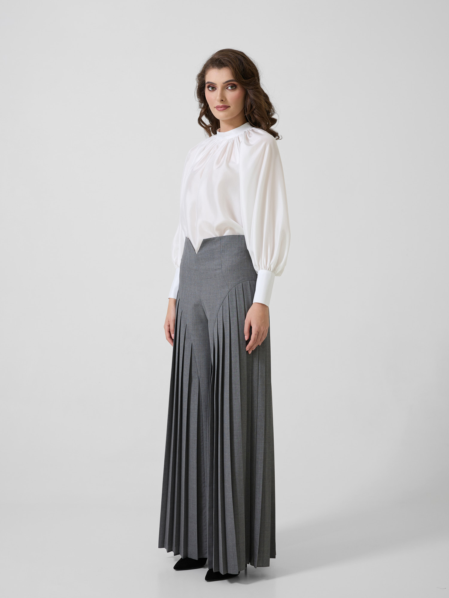 Pantaloni cu talie înaltă și detalii plisate.