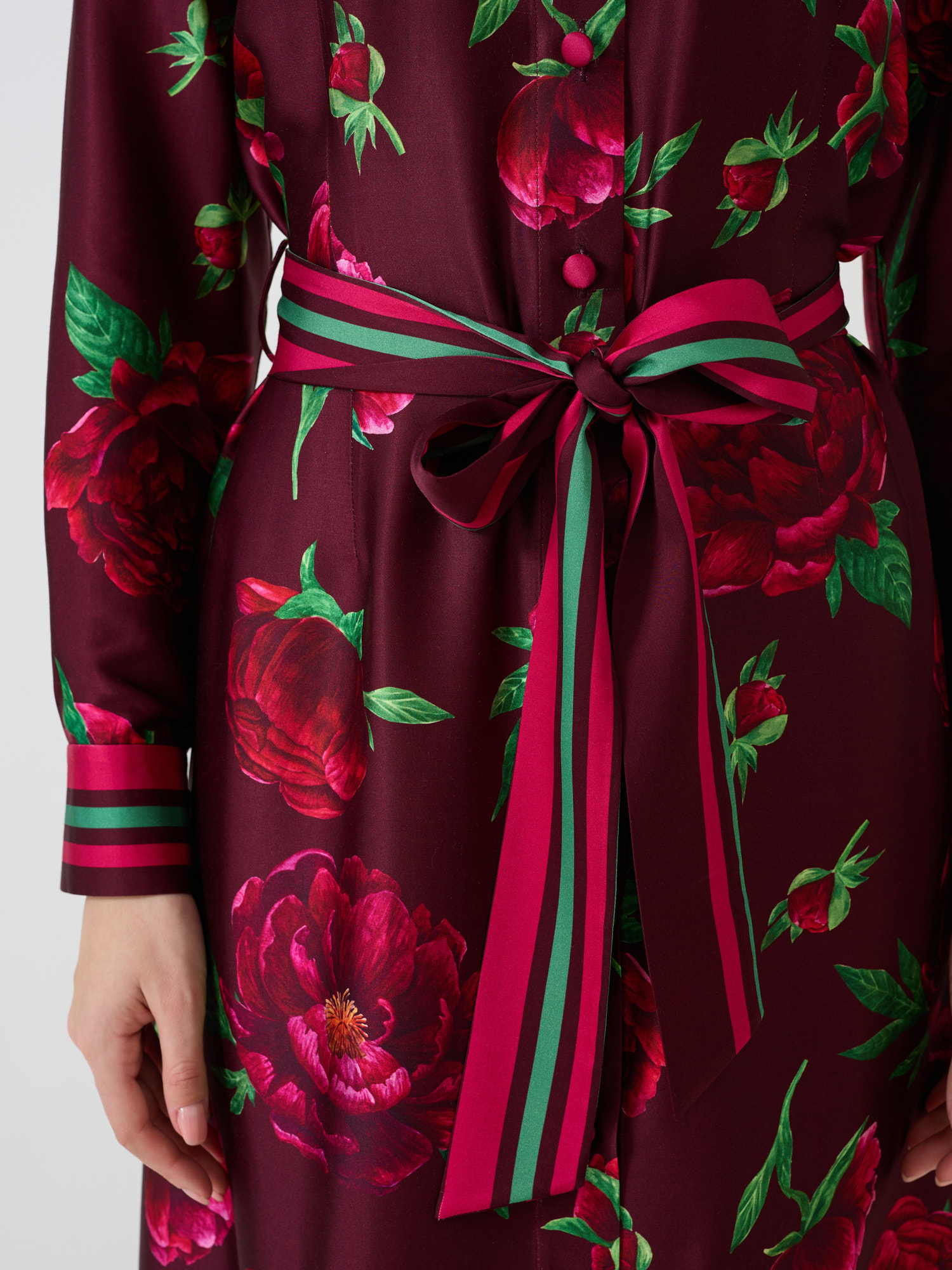 Print unic realizat cu Bujorul Românesc, floarea națională și detalii în dungi asortate.