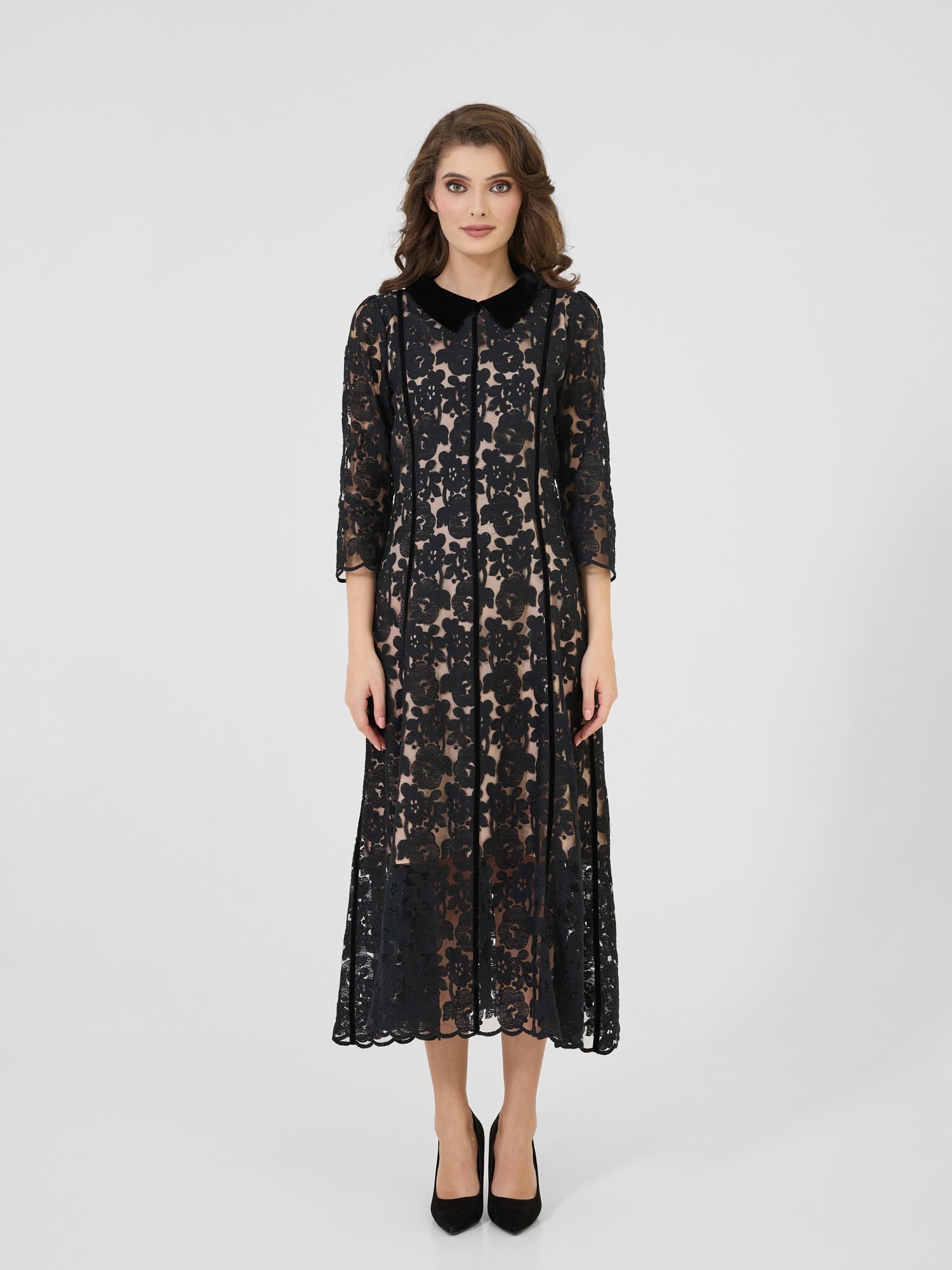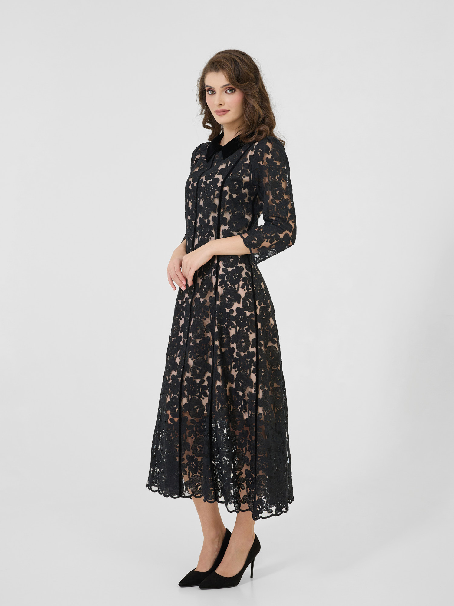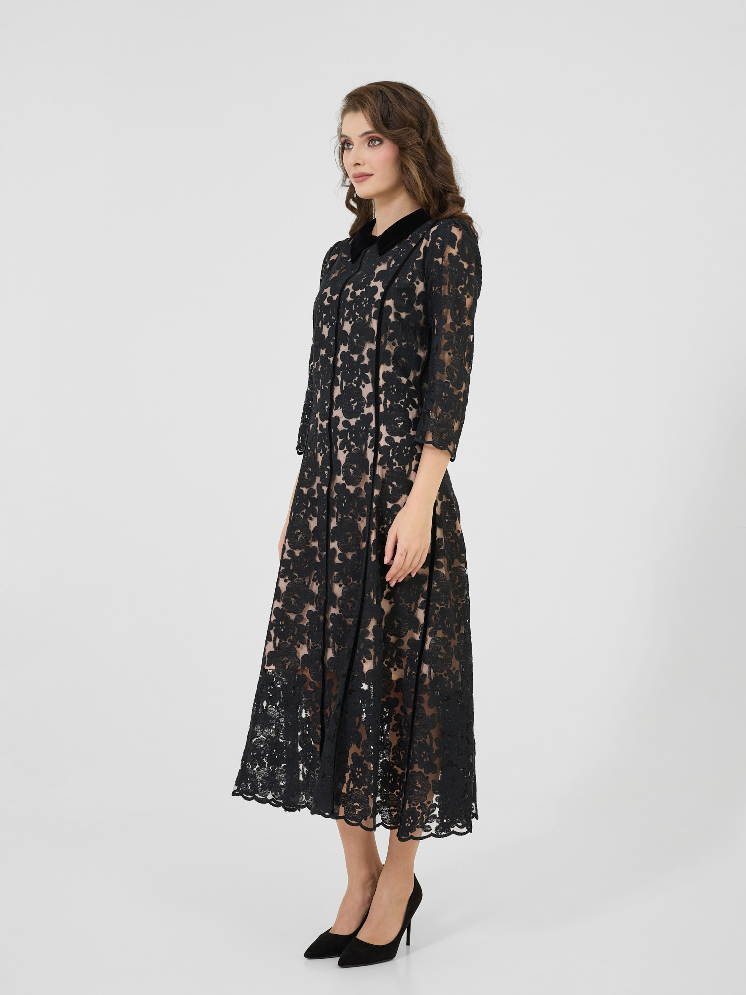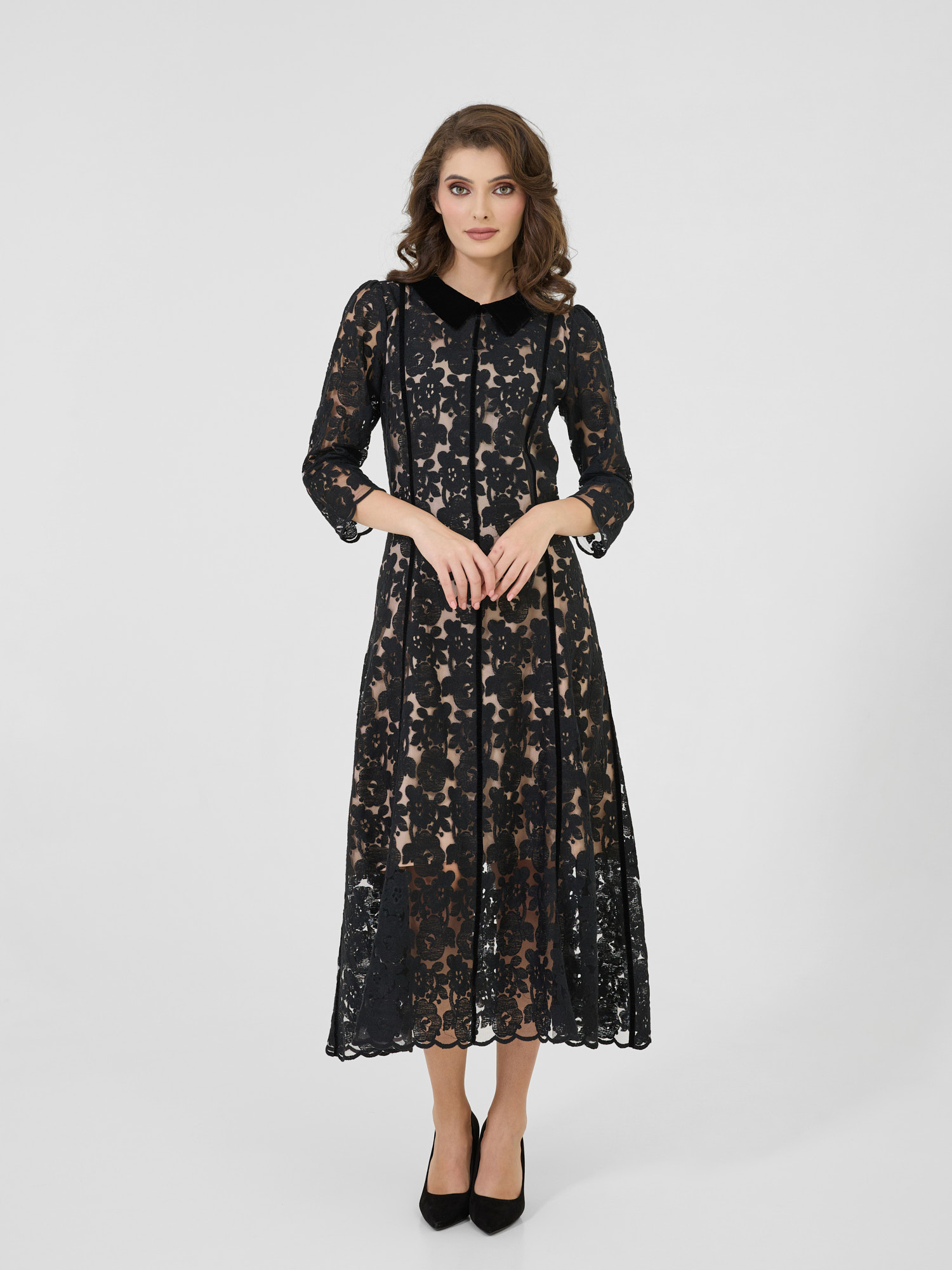 Rochie elegantă și rafinată din dantelă de bumbac cu detalii de catifea.