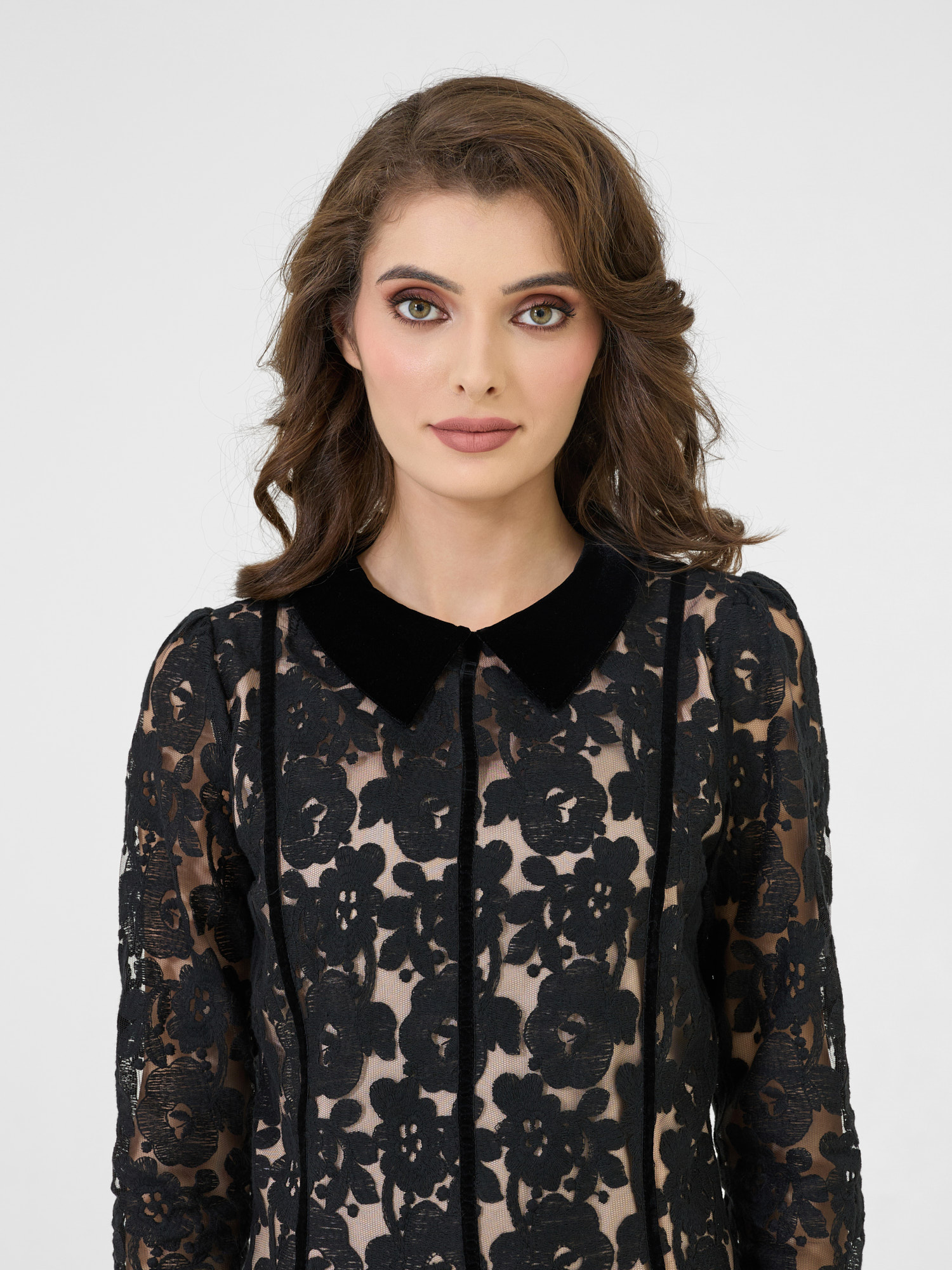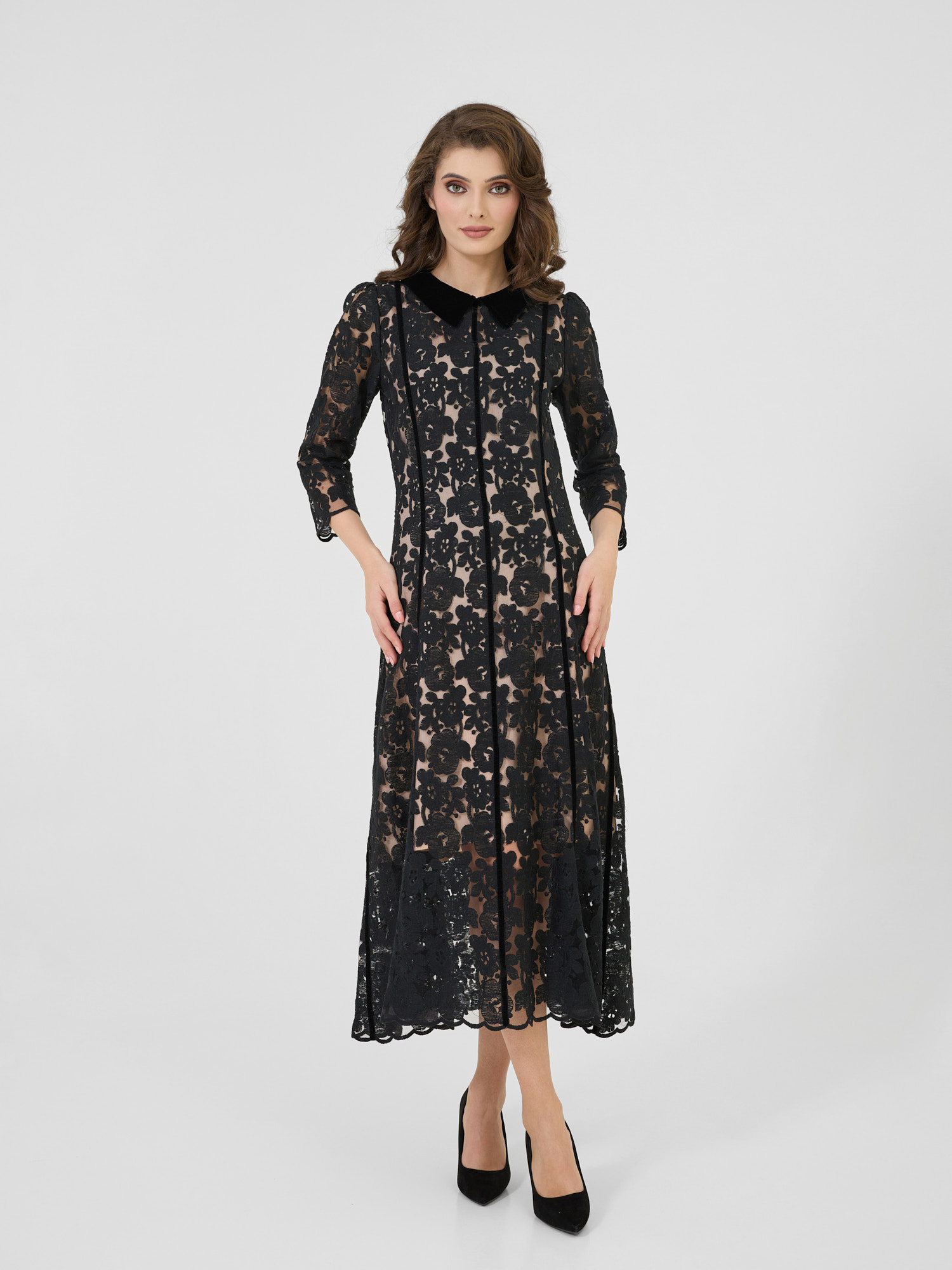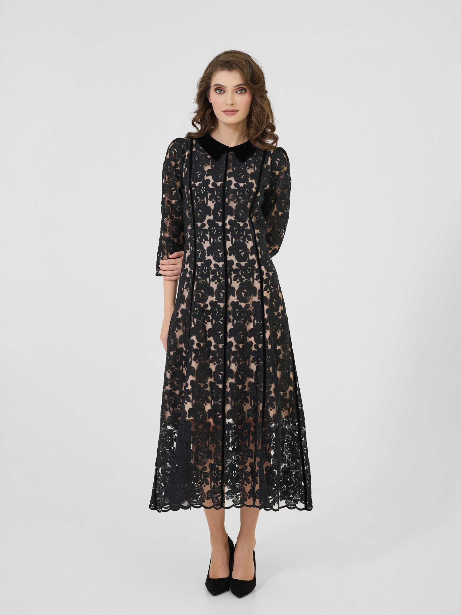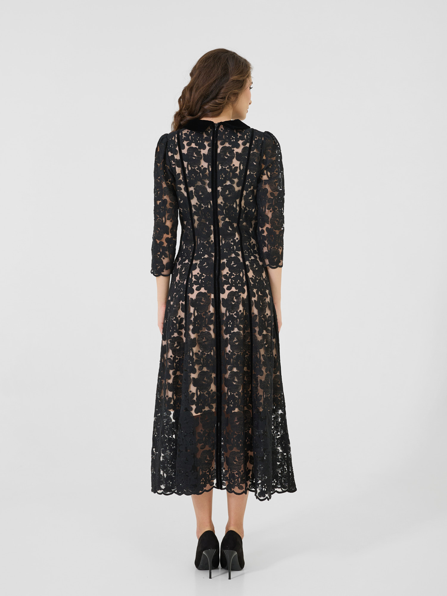 Rochie elegantă și rafinată din dantelă de bumbac cu detalii de catifea.