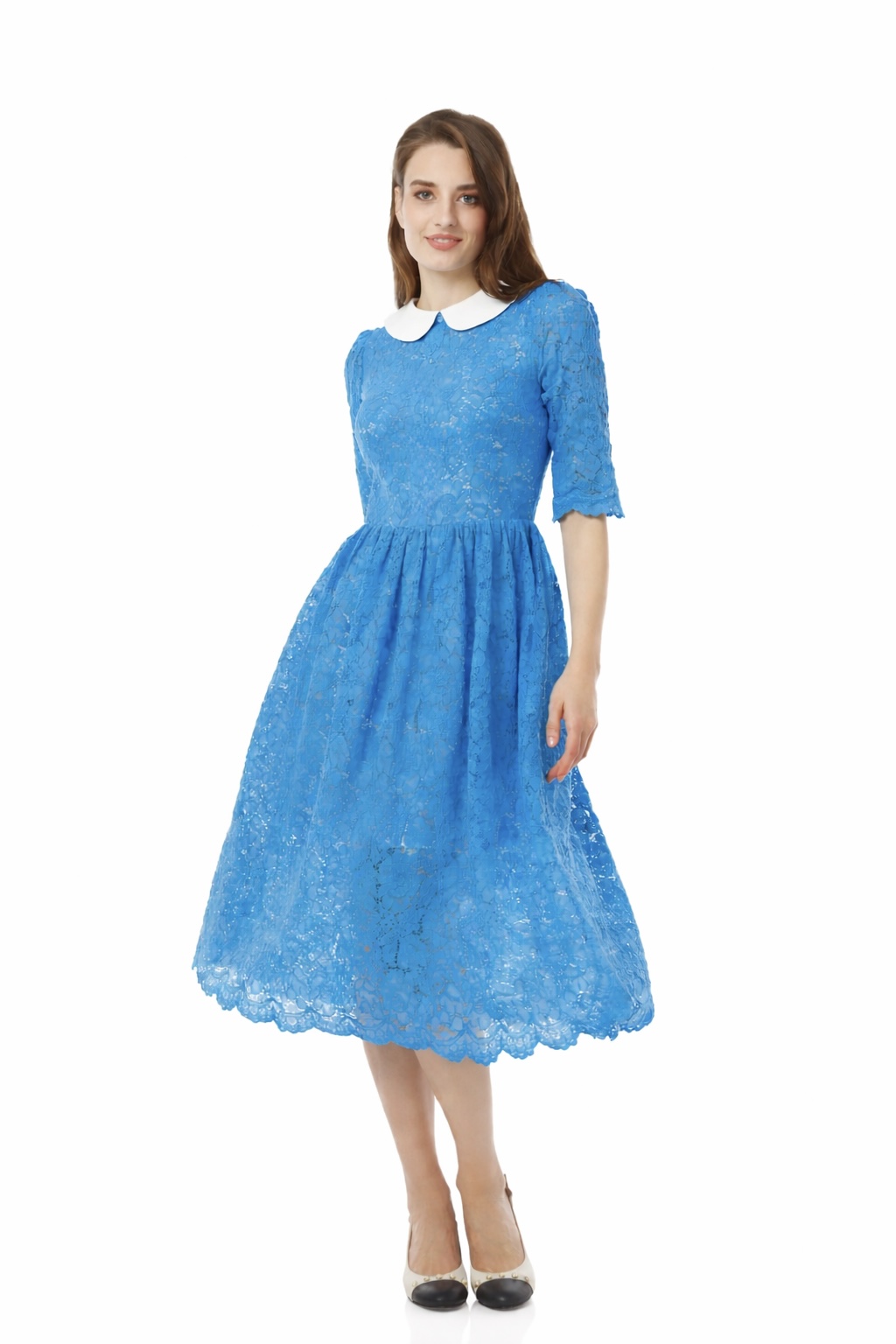 Rochie midi din dantelă de bumbac cu guleraș alb