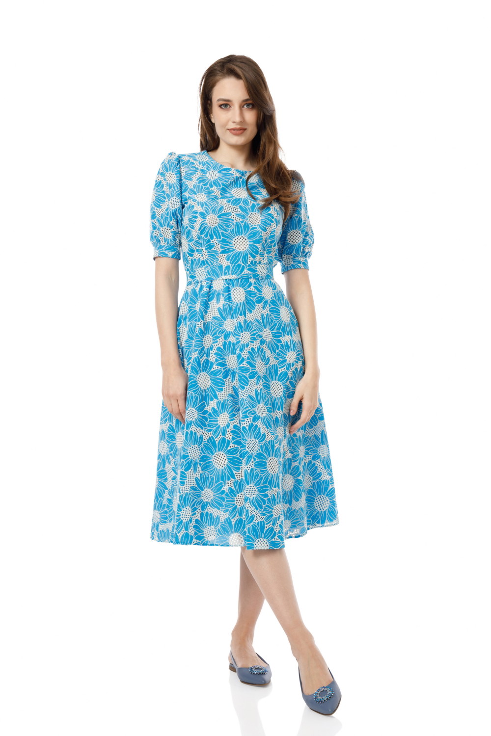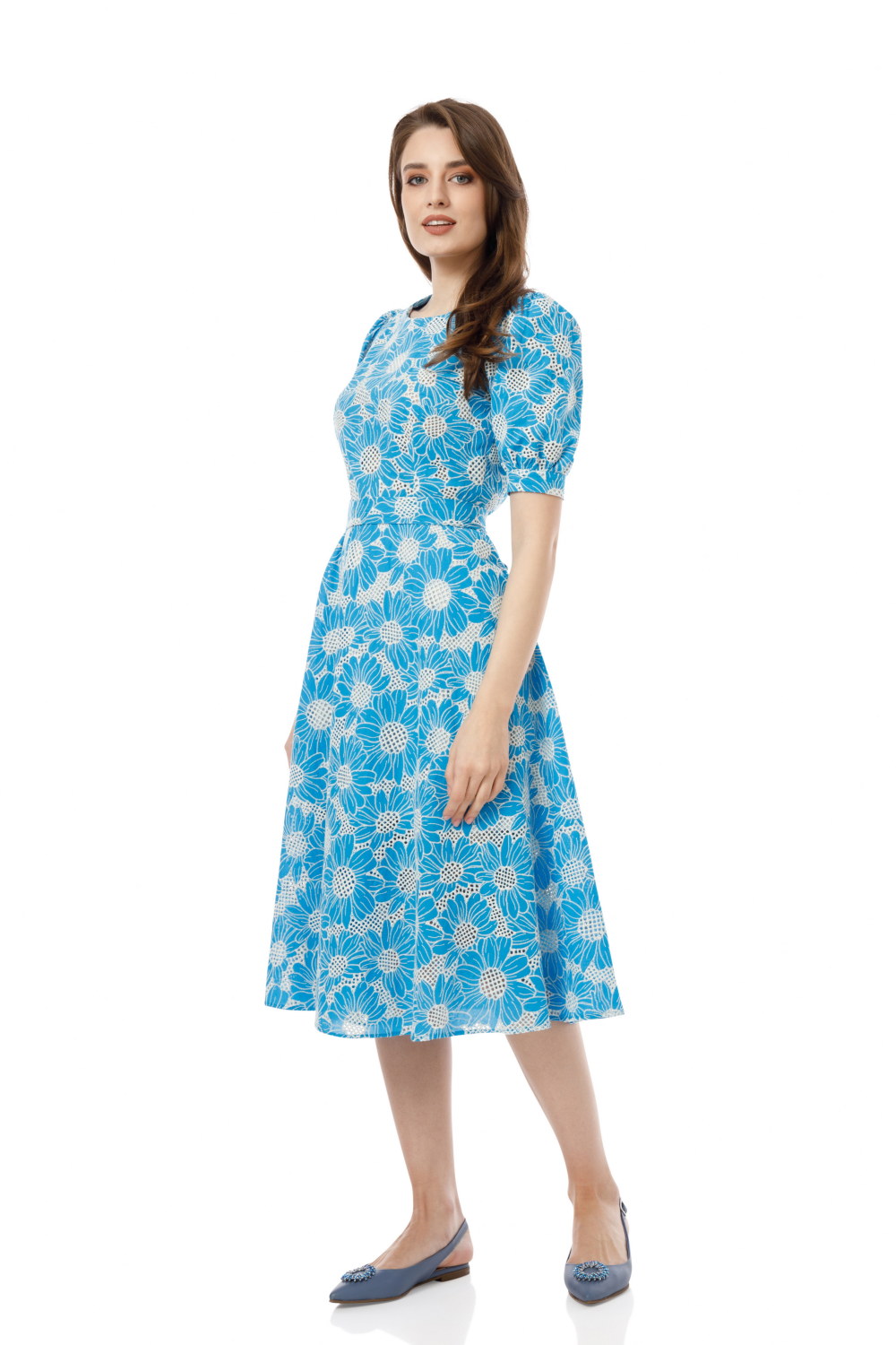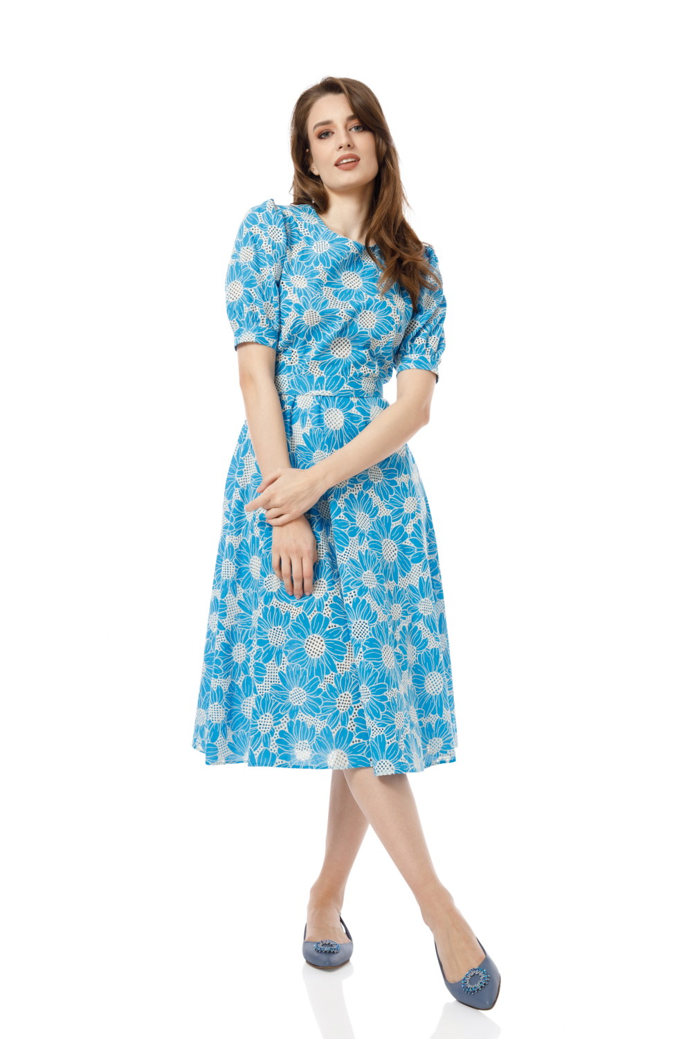 Fusta în semi cloș, partea de sus cu decolteu rotund, mânecă până la cot cu manșetă îngustă fixă și ușor creț pe umăr.