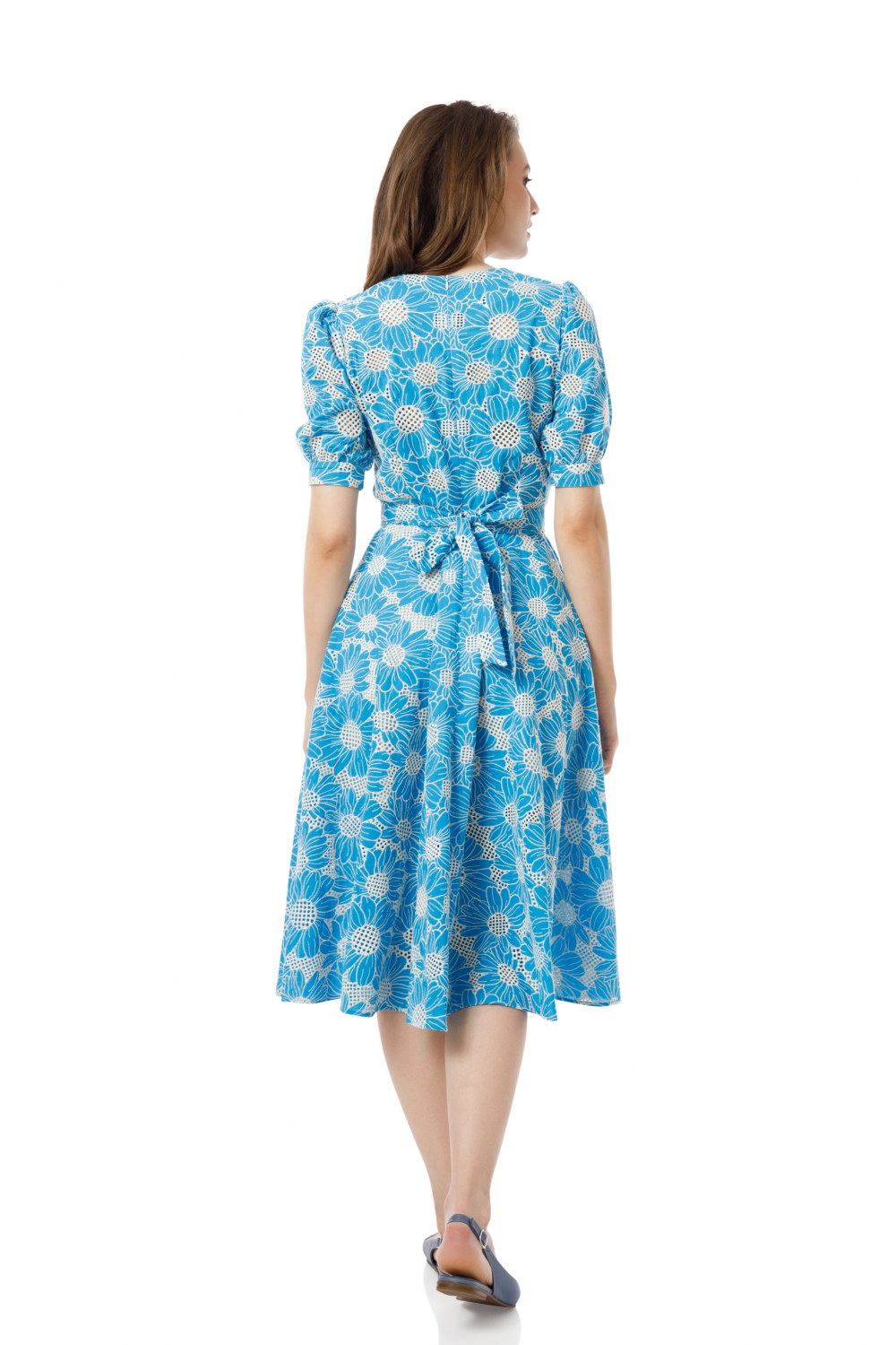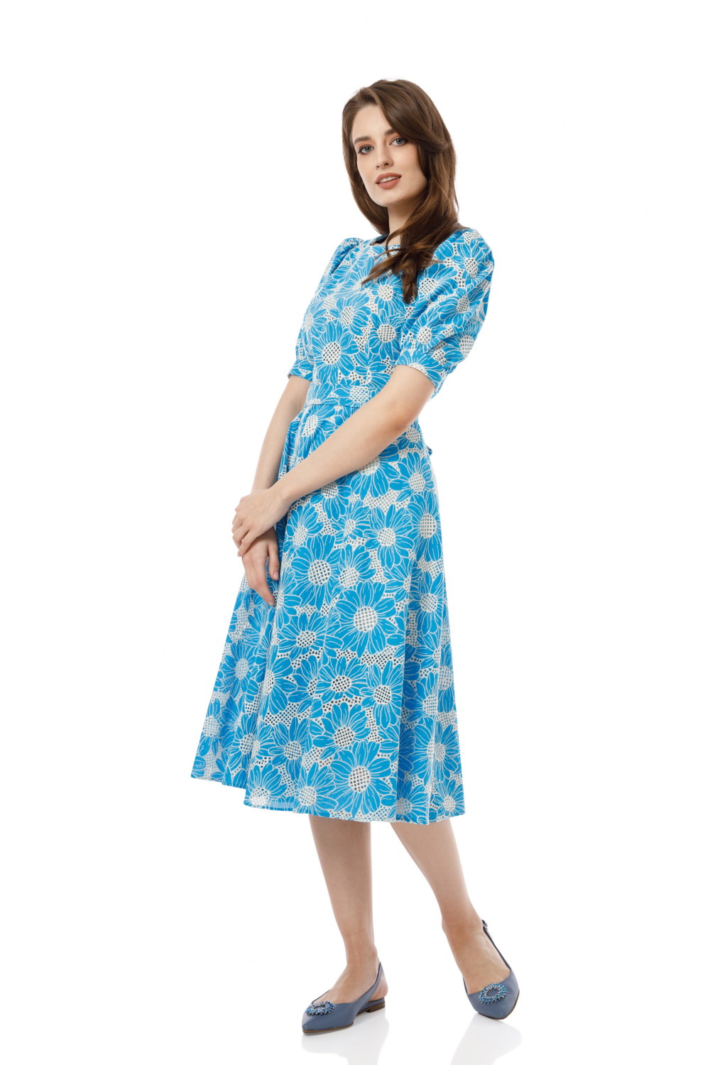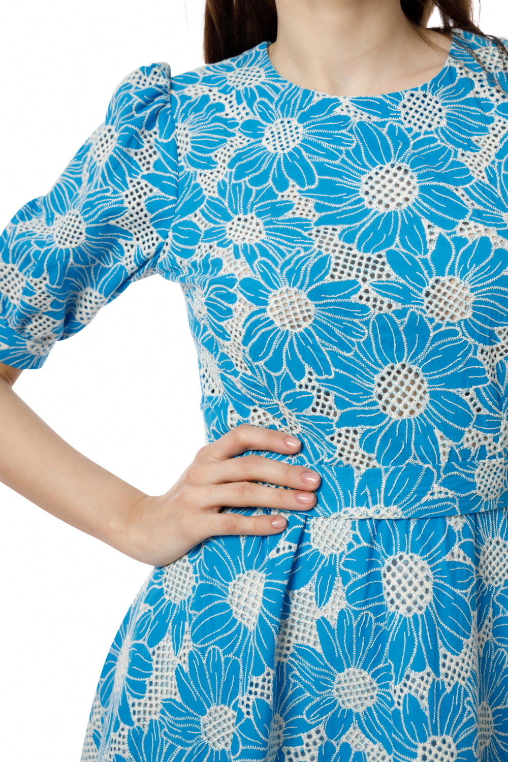 Fusta în semi cloș, partea de sus cu decolteu rotund, mânecă până la cot cu manșetă îngustă fixă și ușor creț pe umăr.