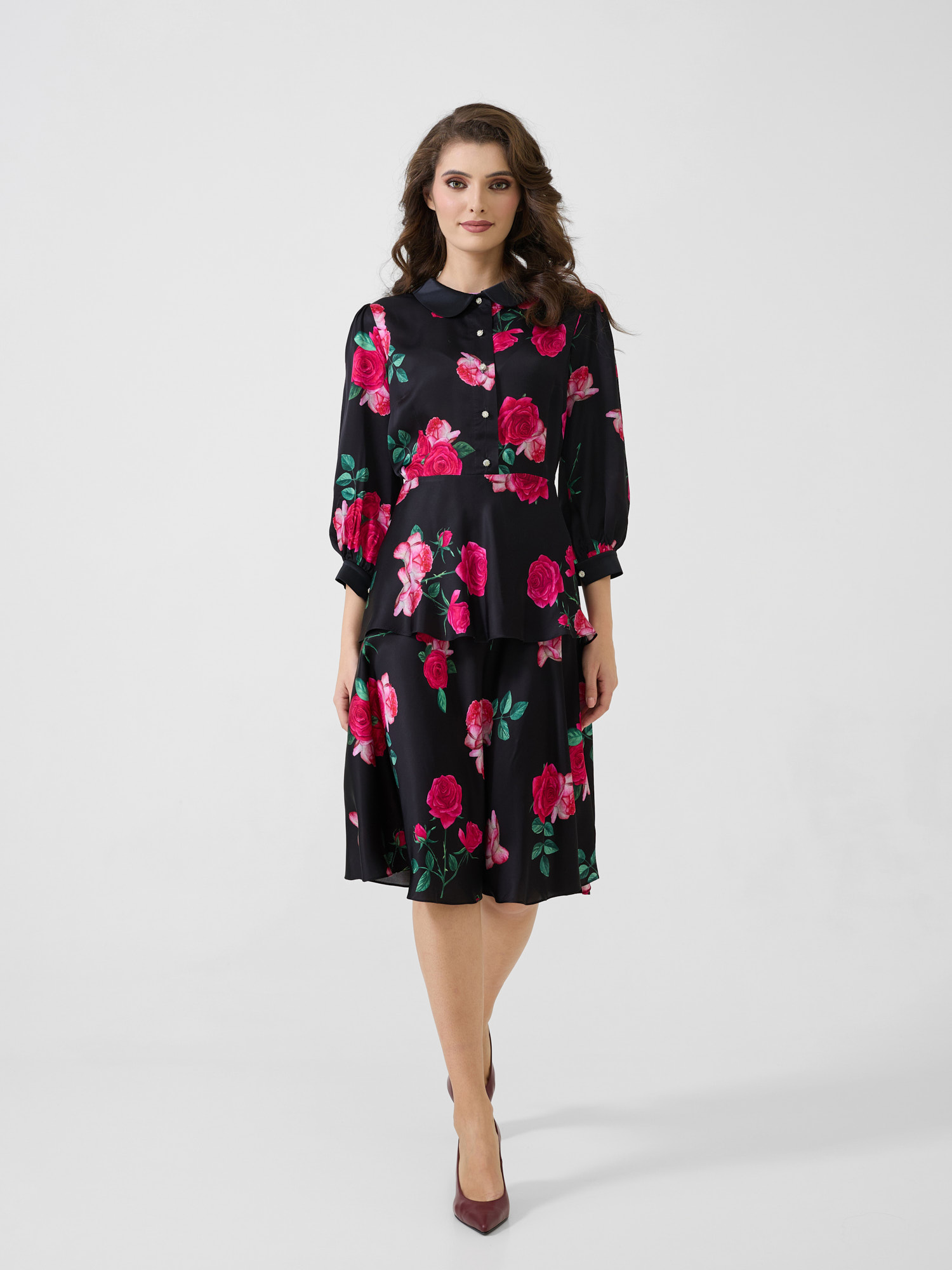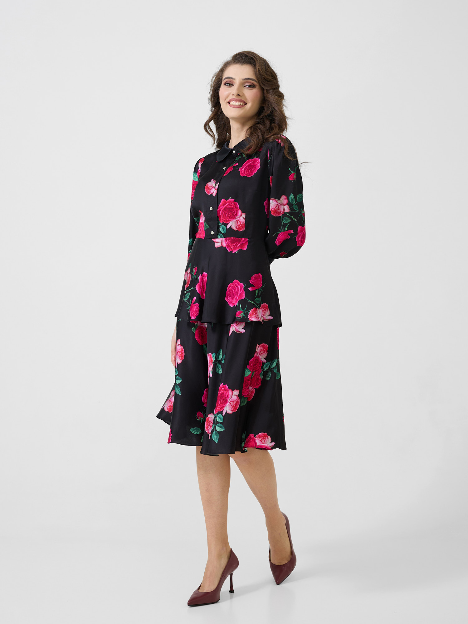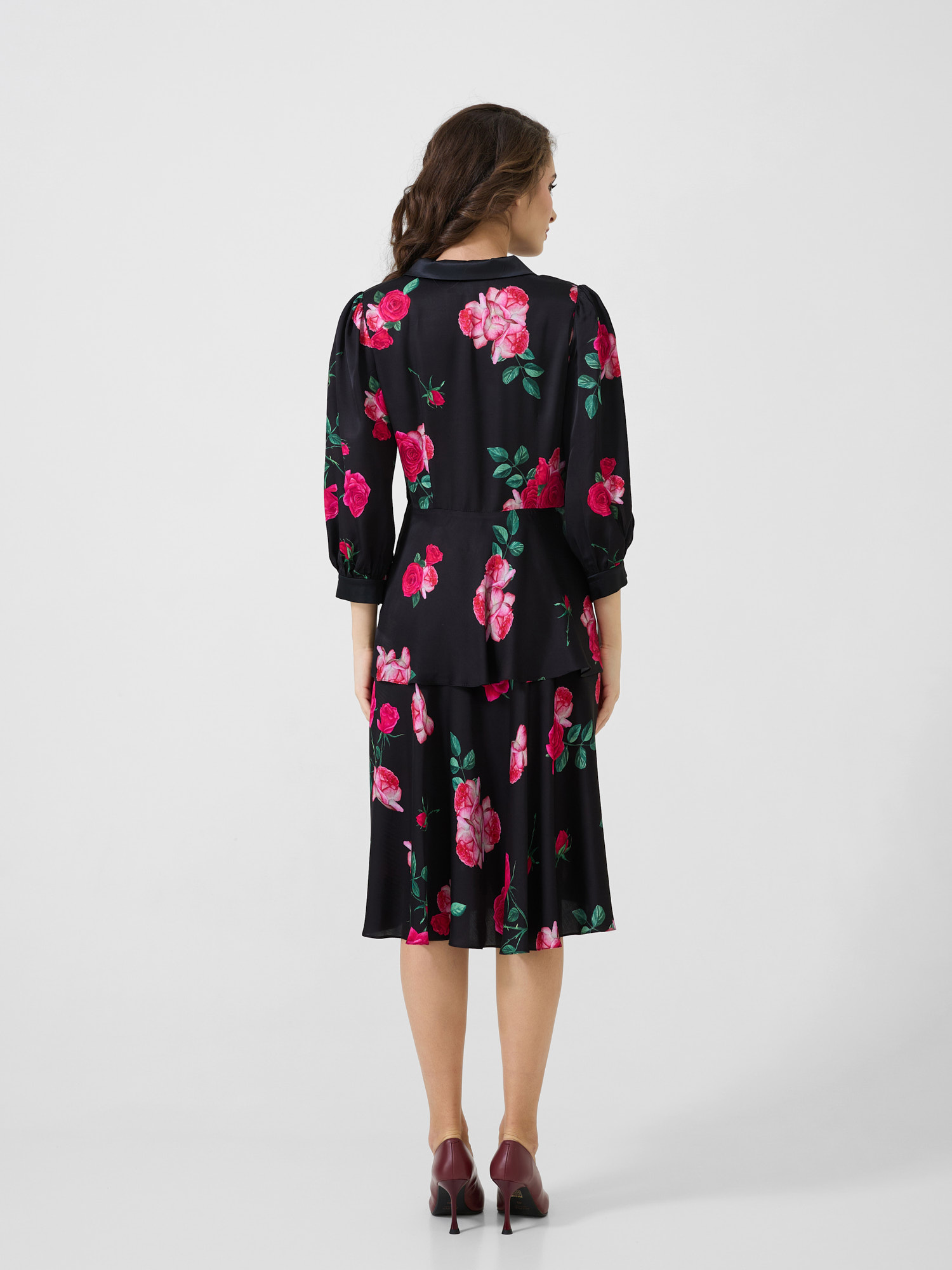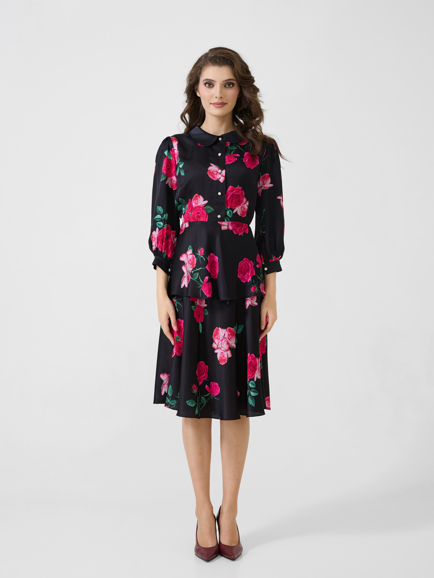 Rochie midi fluidă și elegantă cu print tradafiri roz și nasturi bijuterie.