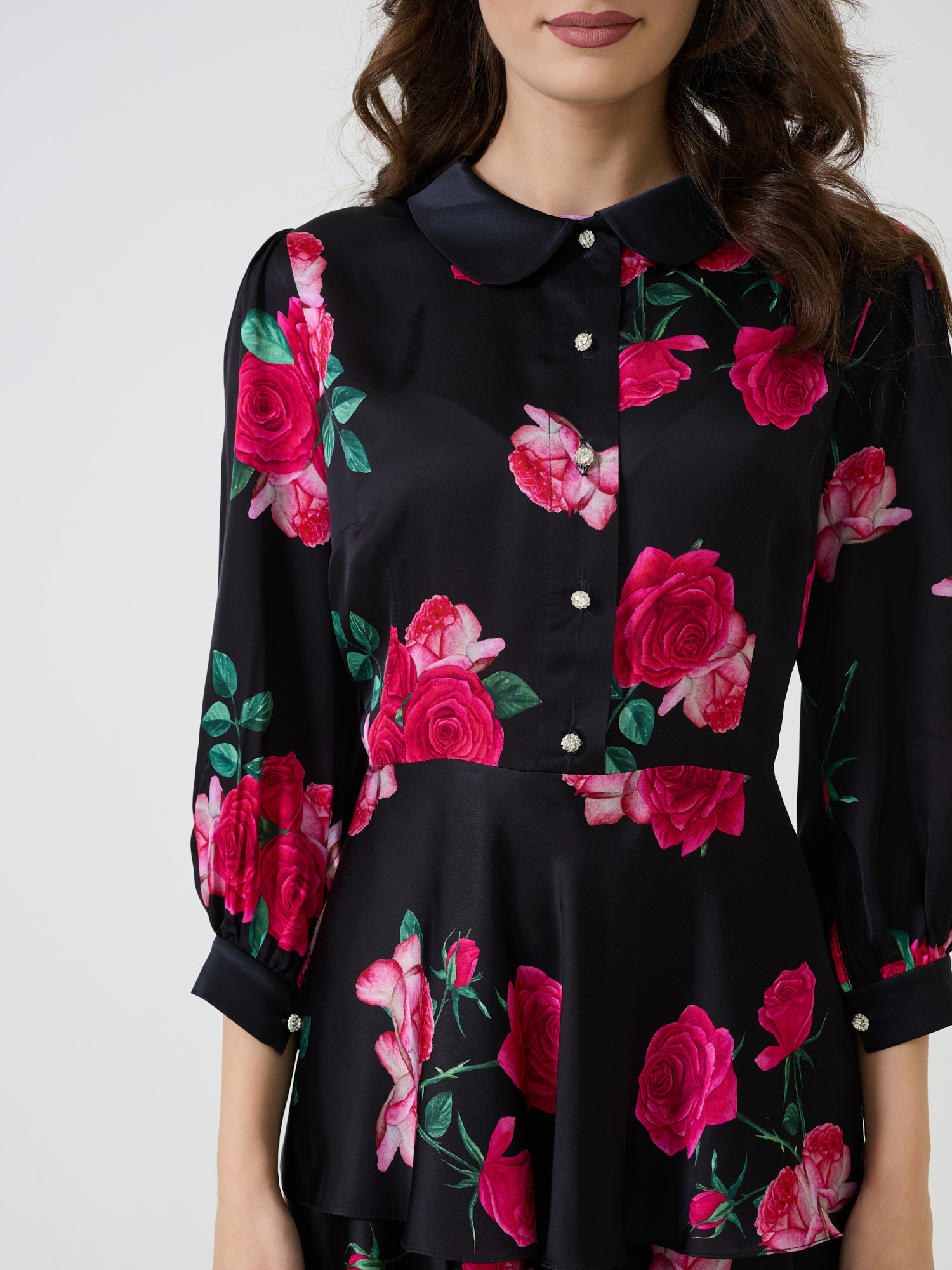 Bust tip cămașă cu fentă și nasturi bijuterie și guler rotund din mătase neagră.