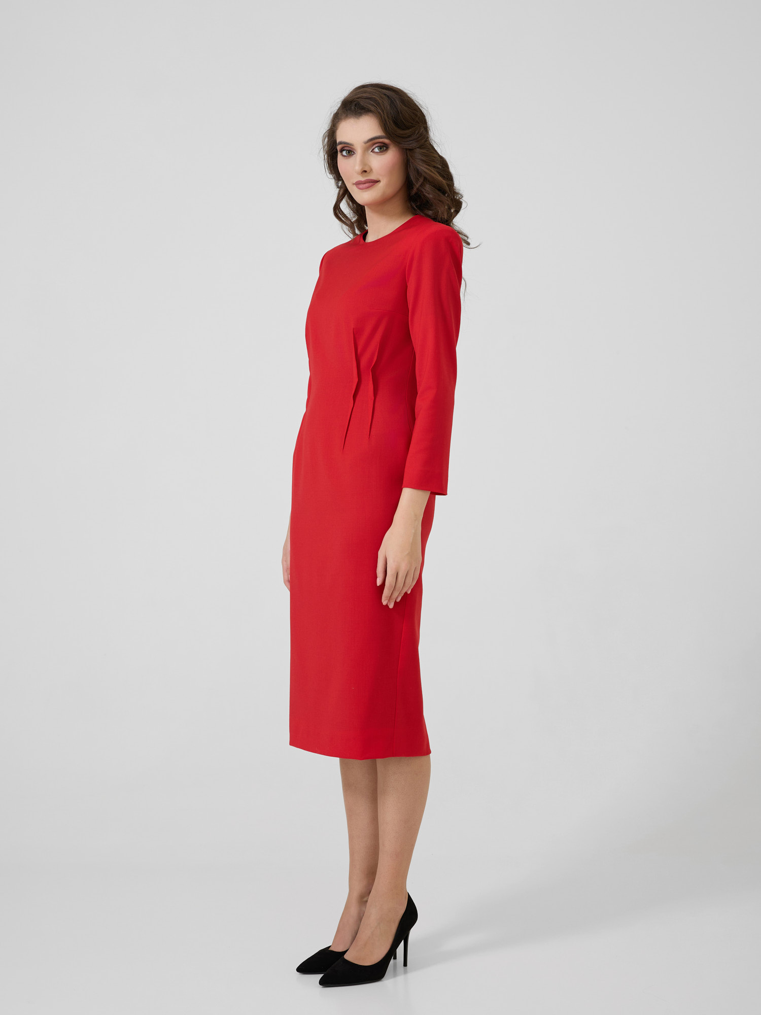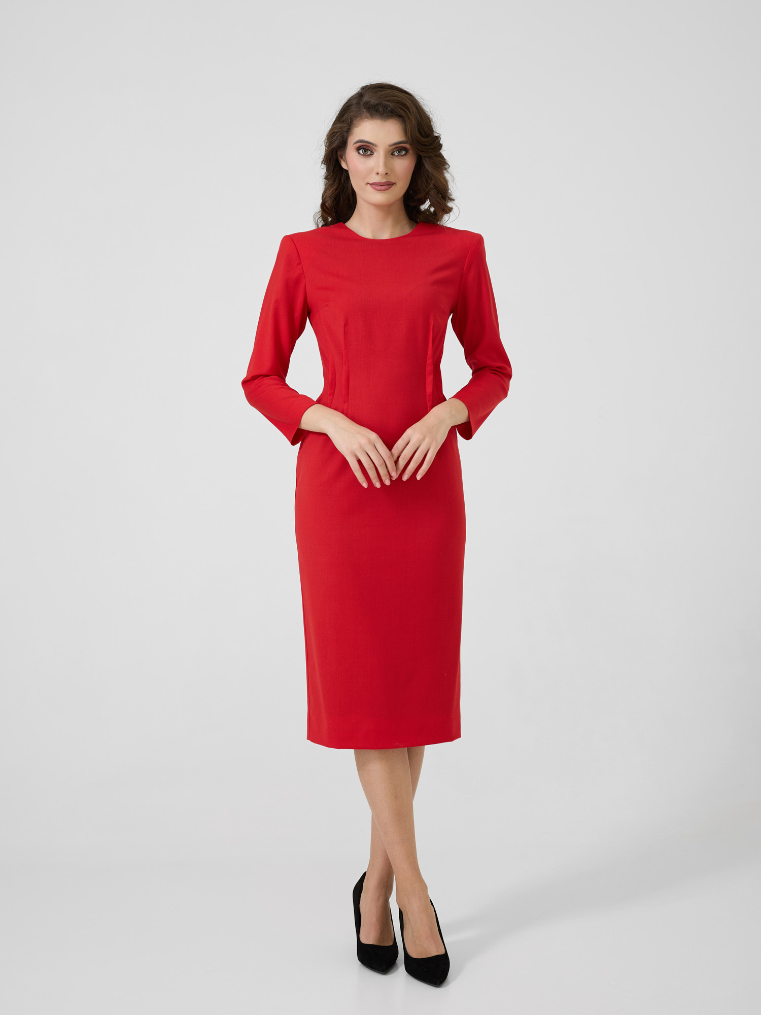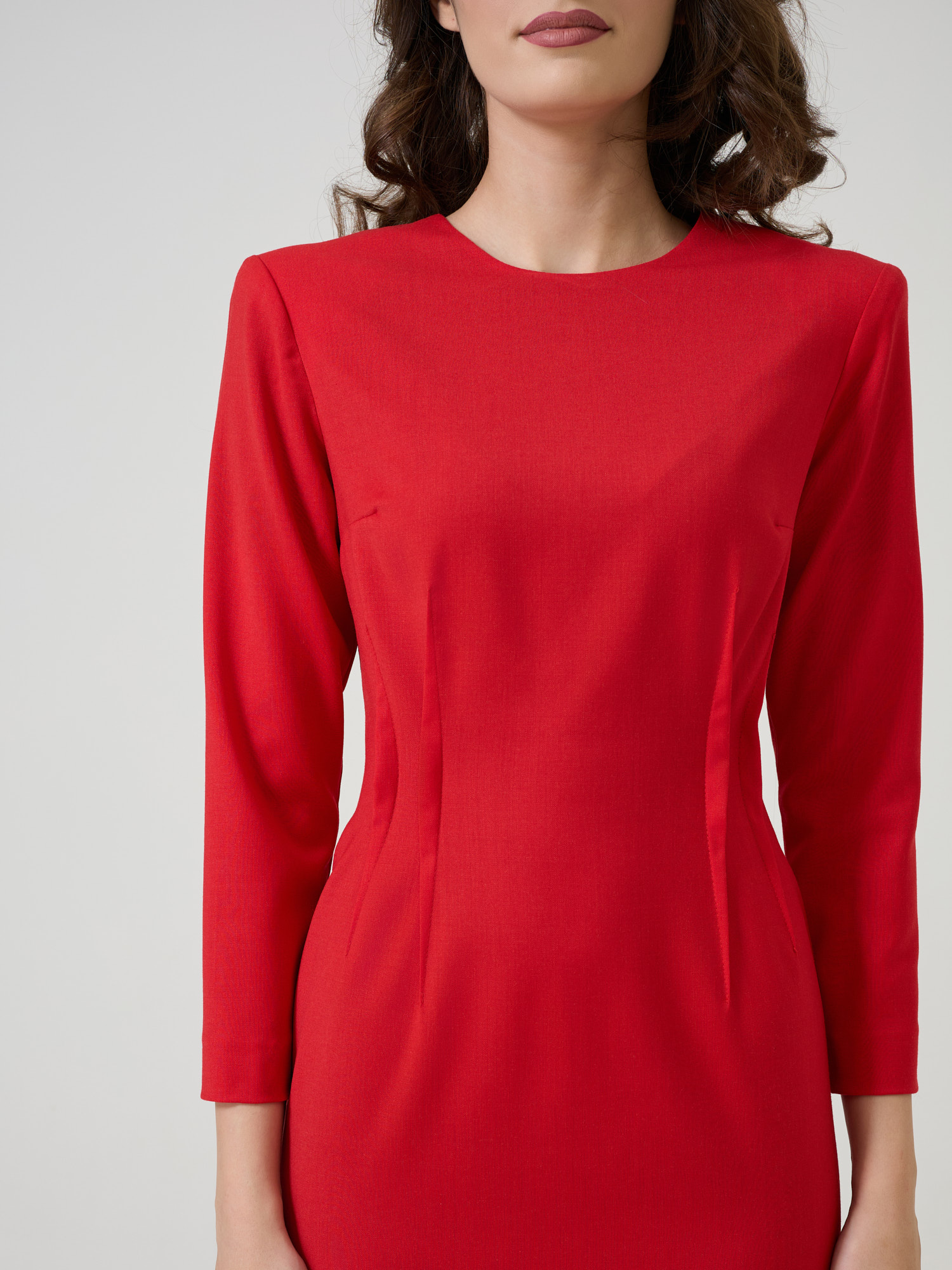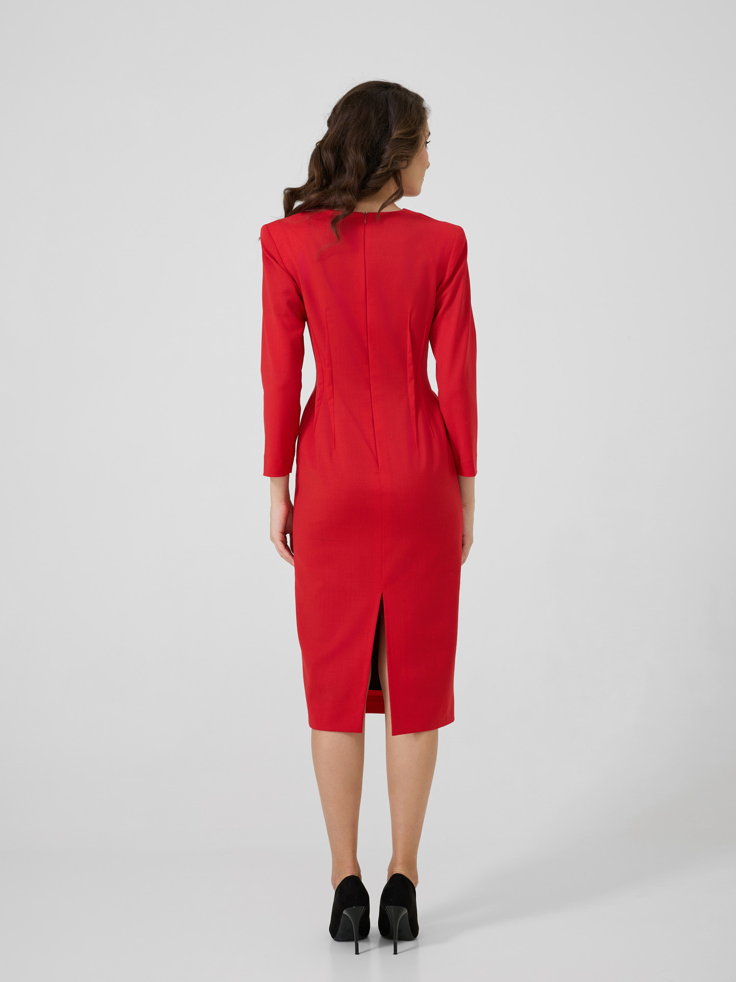 Rochie midi din lână cu umeri sculpturali.