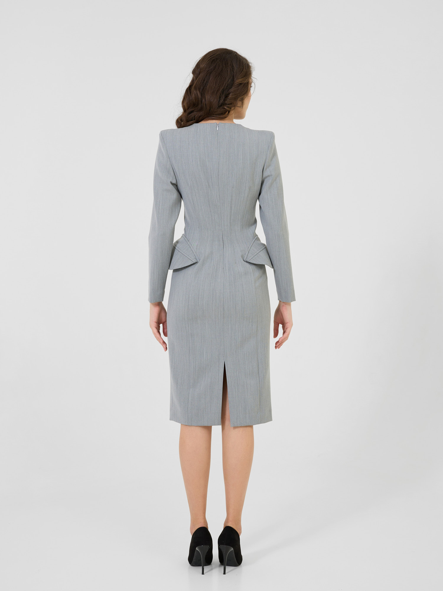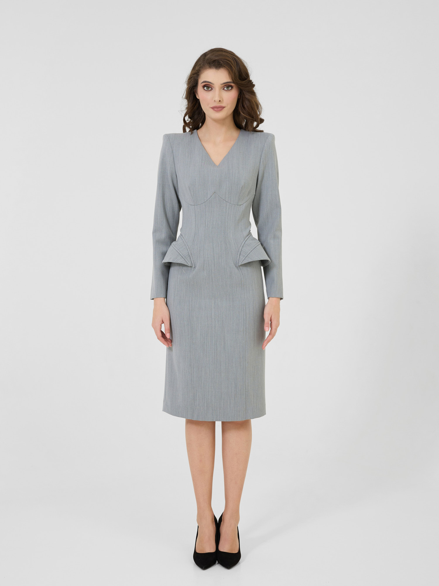 Croială cambrată sculpturală care marchează talia și evidențiază șoldul prin aripioare sculpturale, creând efectul de clepsidră.